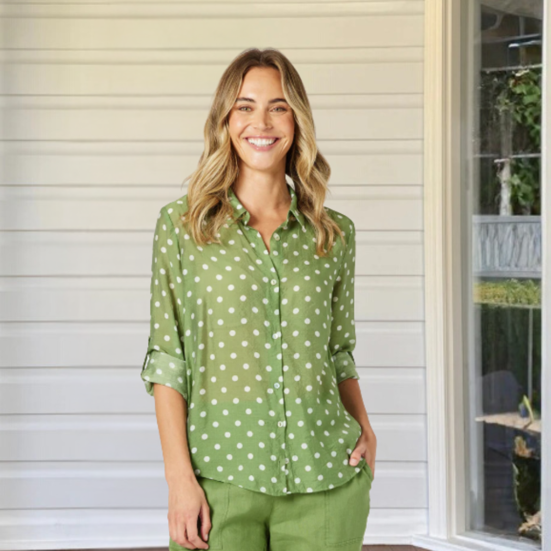 - The Basil Spot Shirt features a playful white spot print on a freash basil green base in our classic Glordon Smith shirt silhouette.