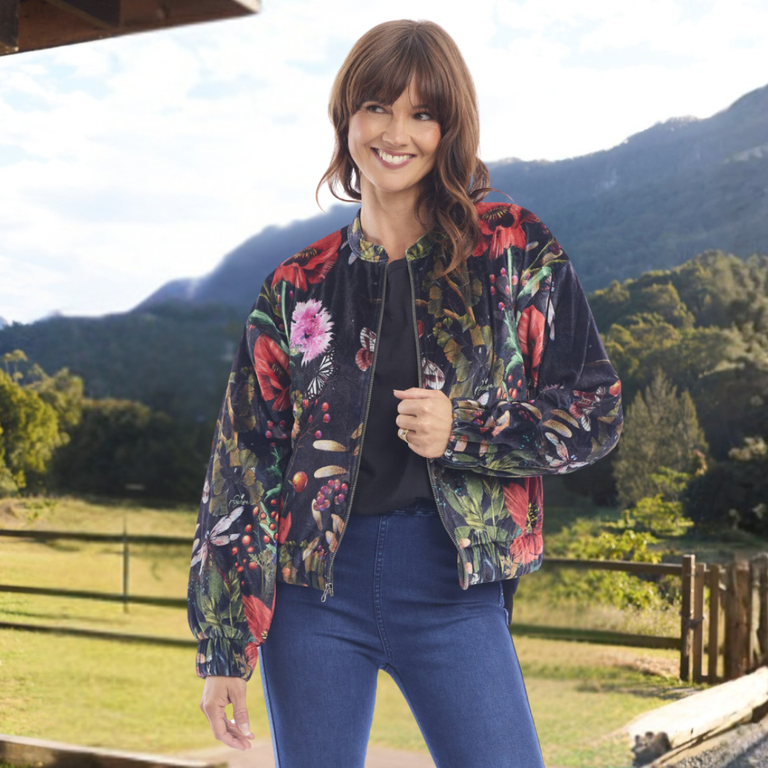 Elevate your look with this short-length bomber jacket, crafted from soft polyester velvet for a rich texture and lightweight feel. Featuring a full-zip front with a concealed button placket, it offers a streamlined and polished finish. The round collar and long sleeves with gathered cuffs create a classic bomber silhouette, while the vibrant prints bring a bold and stylish touch. Perfect for layering in transitional seasons, this versatile jacket combines casual comfort with statement-making design.