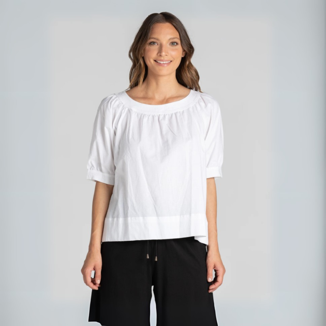The Boom Shankar Bliss Top is a flowy and flattering summer top with a round neckline and elbow-length cuffed sleeves.
