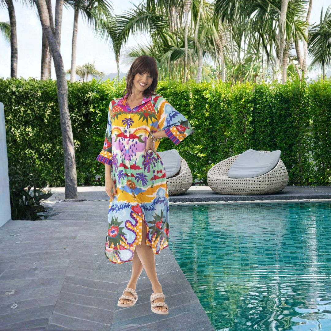 Answer the call of adventure in the soul-stirring Briana Shirt Dress. With a whimsical print that exudes love of the beachside, it is crafted from breathable linen, this versatile piece features fun prints, vibrant colour, a crisp collar, full-length button placket, and practical side pockets. Perfect for any occasion, it transitions seamlessly from day to evening, ensuring you look effortlessly chic wherever you go.