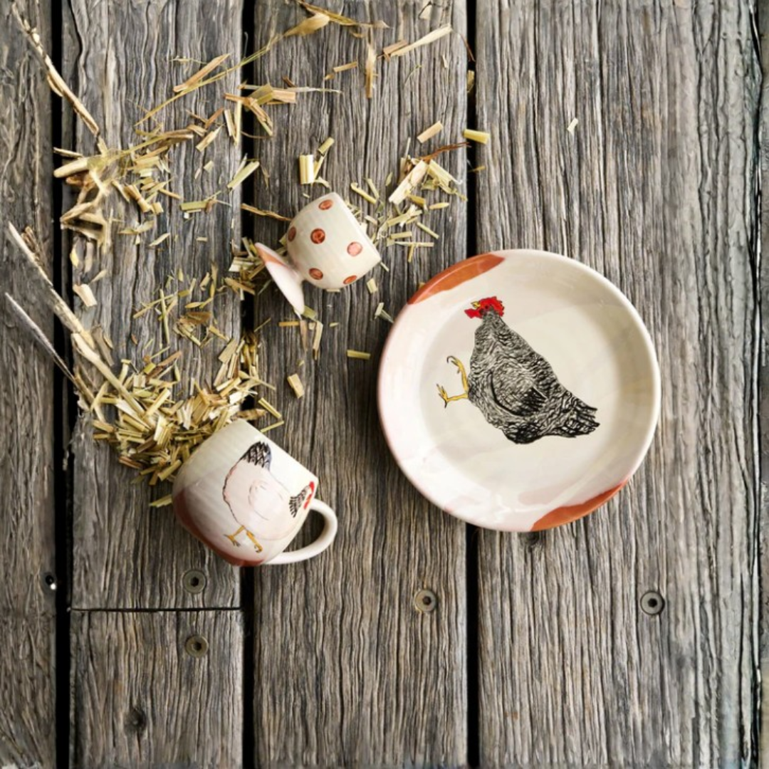 A delightful collaboration with the talented Emogen Clark. Her love of chickens and the joy they bring is something to be shared and celebrated with our pottery.