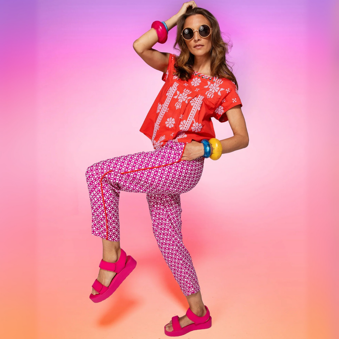 The Kelsey Pant is the perfect lightweight summer pant. The elasticated back waistband means they are both stylish and comfortable, high waisted slim pants, cropped length, tie front waistband, 2 side pockets.