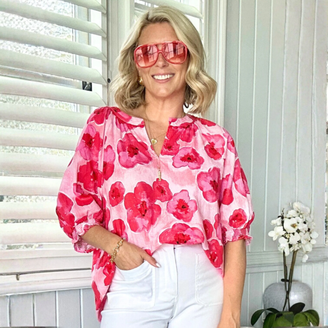 Brighten up your wardrobe with the Pink Poppies Print Top.