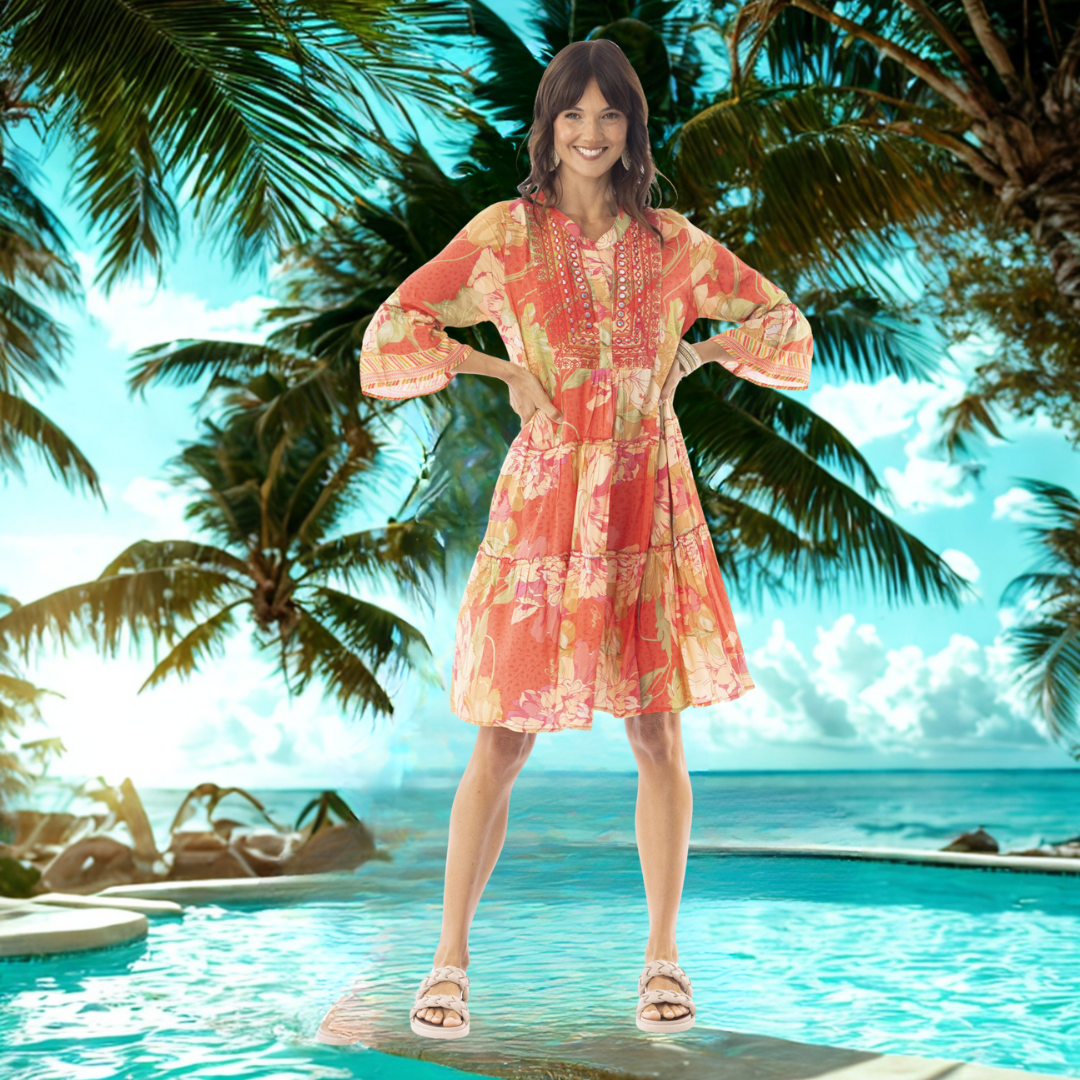—a breezy, feminine piece designed for sunlit days. Crafted in soft 100% rayon, it features a mandarin collar with a button-up front, embroidered detailing at the neckline, and playful three-quarter frill sleeves. The tiered skirt falls just at the knee, creating gentle movement with every step. Adorned in warm rose tones and hand-drawn prints, this dress brings a touch of wanderlust and charm to any occasion.