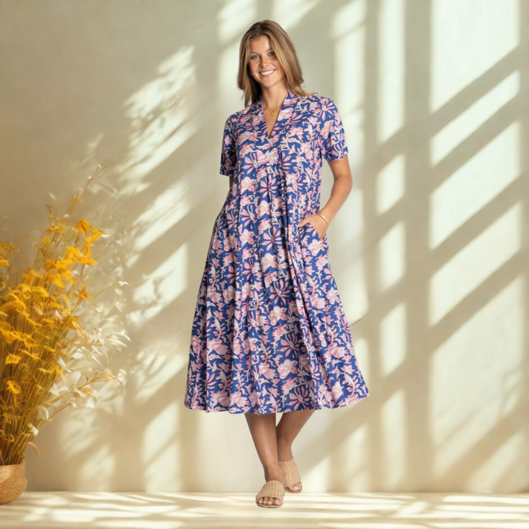 Step out in effortless style with the IBSA Tennessee Midi Dress. This flattering A-line dress features a V-neck, short cuffed sleeves, and practical side pockets for a perfect blend of fashion and function. Made from 100% soft printed cotton, it’s breathable, comfortable, and ideal for all-day wear. Designed in Australia, the Tennessee Midi Dress is perfect for brunches, casual outings, or a relaxed office look. Add a touch of timeless elegance to your wardrobe today!